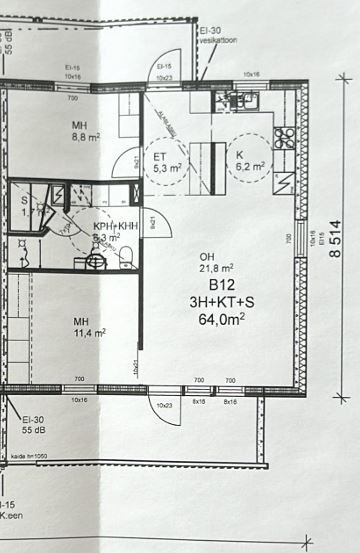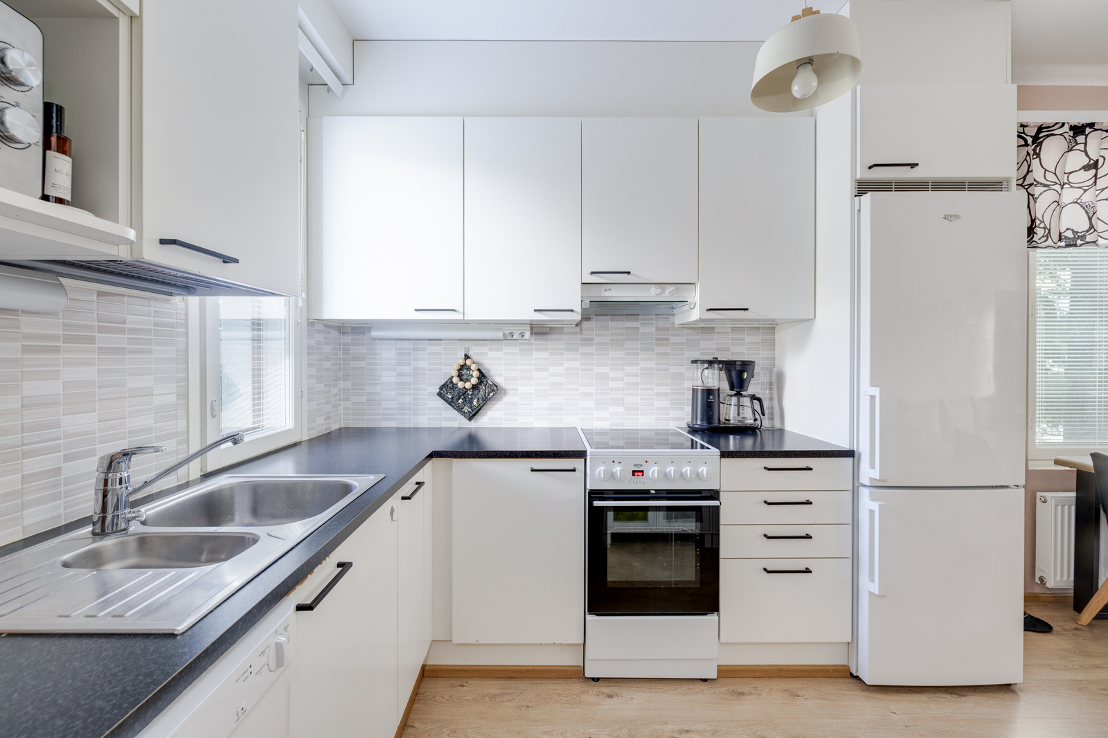 | Keittiö: | Varustus: jääkaappi/pakastin, liesituuletin, astianpesukone. Työtasot: laminaatti. Liesi: keraaminen. Lattia: laminaatti. Seinät: maalattu |