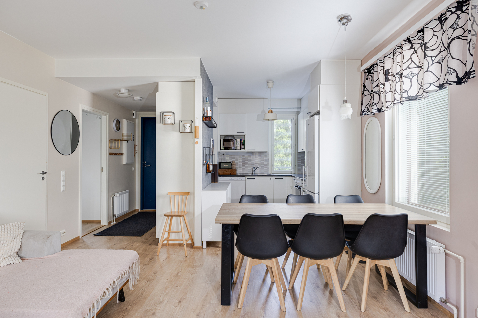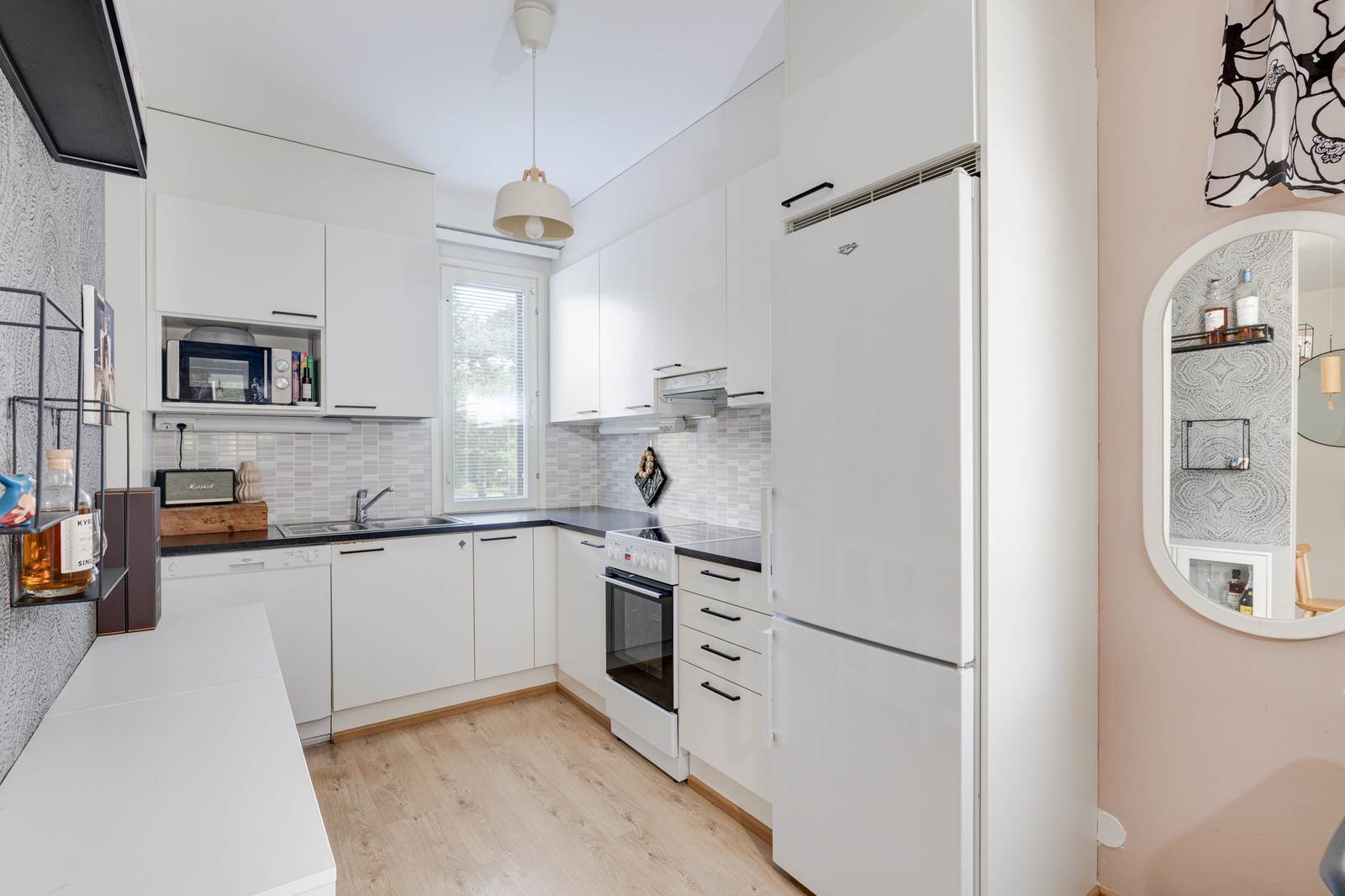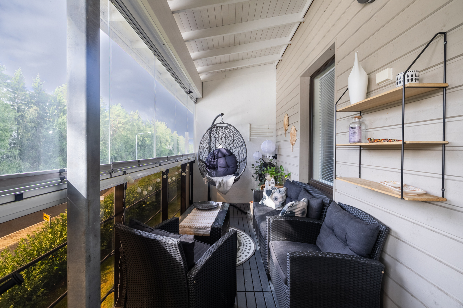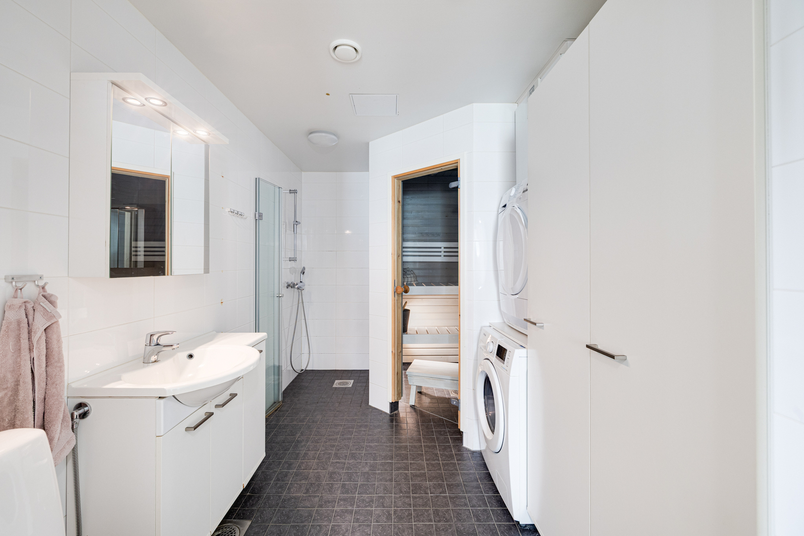 Gerbyn alkupäässä sijaitseva kaunis, saunallinen päätyasunto v. 2016 valmistuneessa 24 asunnon luhtitaloyhtiössä. Tässä viihtyisässä kodissa on tehokkaasti käytetyt neliöt, kun 3h+k+s mahtuvat 64 m². Keittiö ja olohuone ovatkin kätevästi yhtenäistä tilaa. Lisävaloisuutta asuntoon tuo päädyllä oleva ikkuna. Olohuoneesta on kulku isolle, viehättävälle, lasitetulle parvekkeelle, jolla saat nauttia auringosta aina alkuiltaan saakka. Asunnossa on kaksi suhteellisen hyvän kokoista makuuhuonetta, vaikka neliöitä ei tämän enempää olekaan. Saunaosasto on sijoitettu makuuhuoneiden väliin. Autopaikka kuuluu asunnolle, samoin ulkovarasto. Lämmitysmuotona on kaukolämpö. Hoitovastike on varsin kohtuullinen (3,50 €/ m²) ja silti talonmiestyötkin on ulkoistettu. ************************************* En vacker gavellägenhet med bastu i början av Gerby, belägen i ett lofthus med 24 lägenheter färdigställt år 2016. Detta trivsamma hem har en effektiv planlösning – 3 rum, kök och bastu ryms på 64 m². Köket och vardagsrummet utgör en praktisk, öppen helhet. Ett fönster i gaveln ger extra ljusinsläpp i bostaden. Från vardagsrummet har man utgång till en stor, charmig, inglasad balkong där du kan njuta av solen ända till tidig kväll. Lägenheten har två relativt rymliga sovrum, trots den begränsade boytan. Bastuavdelningen är placerad mellan sovrummen. En parkeringsplats hör till bostaden, likaså ett uteförråd. Uppvärmningen sker via fjärrvärme. Skötselvederlaget är rimligt (3,50 €/m²) även fast fastighetsskötseln sköts av servicebolag.