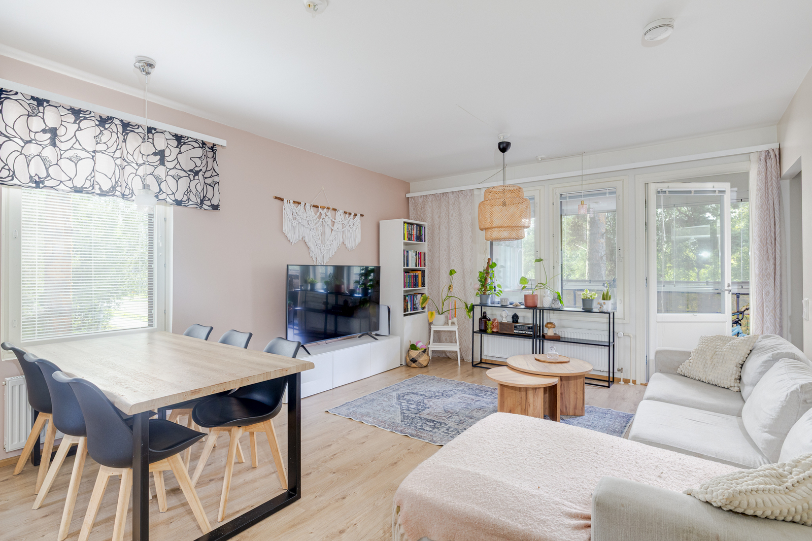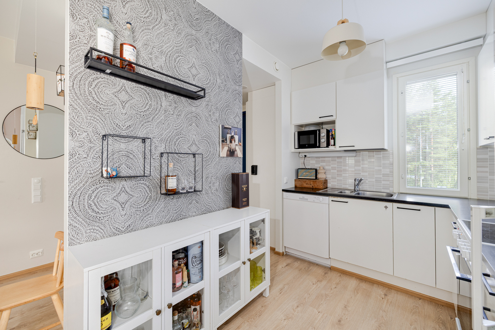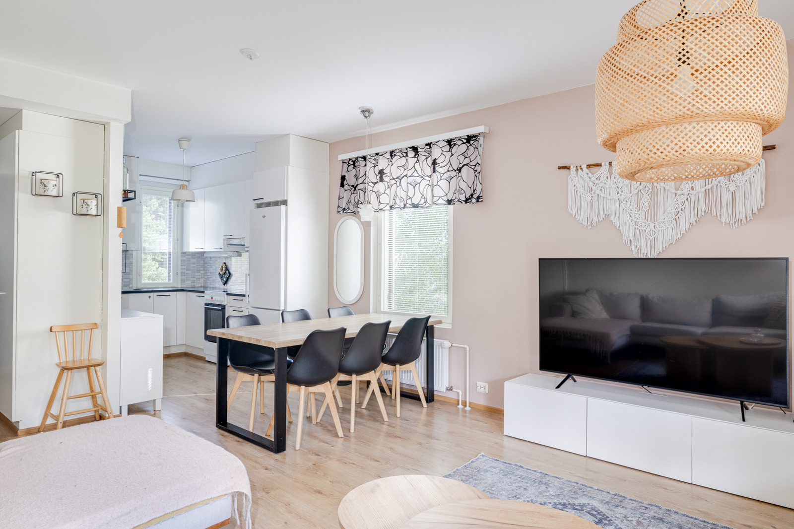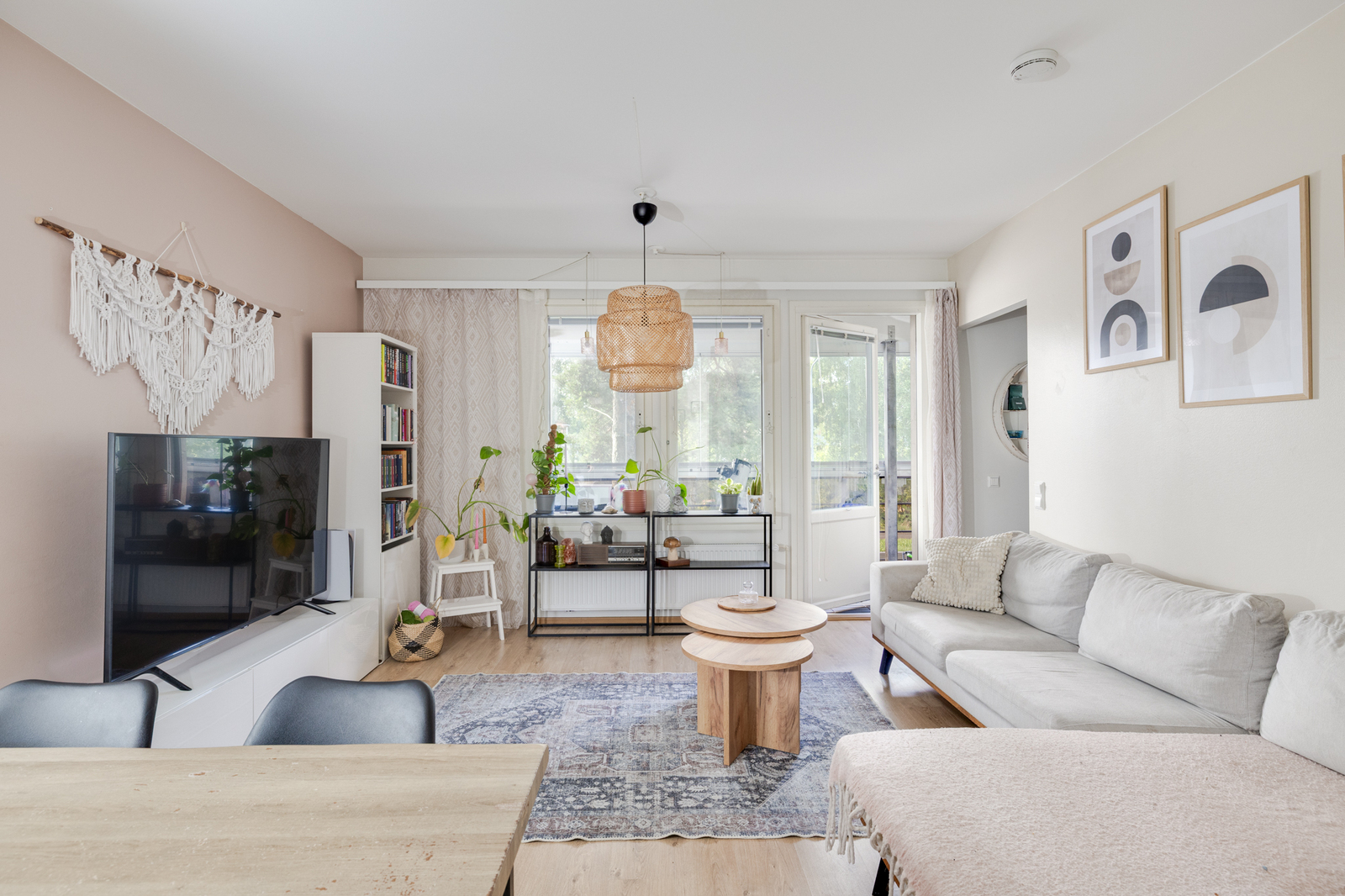 Gerbyn alkupäässä sijaitseva kaunis, saunallinen päätyasunto v. 2016 valmistuneessa 24 asunnon luhtitaloyhtiössä. Tässä viihtyisässä kodissa on tehokkaasti käytetyt neliöt, kun 3h+k+s mahtuvat 64 m². Keittiö ja olohuone ovatkin kätevästi yhtenäistä tilaa. Lisävaloisuutta asuntoon tuo päädyllä oleva ikkuna. Olohuoneesta on kulku isolle, viehättävälle, lasitetulle parvekkeelle, jolla saat nauttia auringosta aina alkuiltaan saakka. Asunnossa on kaksi suhteellisen hyvän kokoista makuuhuonetta, vaikka neliöitä ei tämän enempää olekaan. Saunaosasto on sijoitettu makuuhuoneiden väliin. Autopaikka kuuluu asunnolle, samoin ulkovarasto. Lämmitysmuotona on kaukolämpö. Hoitovastike on varsin kohtuullinen (3,50 €/ m²) ja silti talonmiestyötkin on ulkoistettu. ************************************* En vacker gavellägenhet med bastu i början av Gerby, belägen i ett lofthus med 24 lägenheter färdigställt år 2016. Detta trivsamma hem har en effektiv planlösning – 3 rum, kök och bastu ryms på 64 m². Köket och vardagsrummet utgör en praktisk, öppen helhet. Ett fönster i gaveln ger extra ljusinsläpp i bostaden. Från vardagsrummet har man utgång till en stor, charmig, inglasad balkong där du kan njuta av solen ända till tidig kväll. Lägenheten har två relativt rymliga sovrum, trots den begränsade boytan. Bastuavdelningen är placerad mellan sovrummen. En parkeringsplats hör till bostaden, likaså ett uteförråd. Uppvärmningen sker via fjärrvärme. Skötselvederlaget är rimligt (3,50 €/m²) även fast fastighetsskötseln sköts av servicebolag.