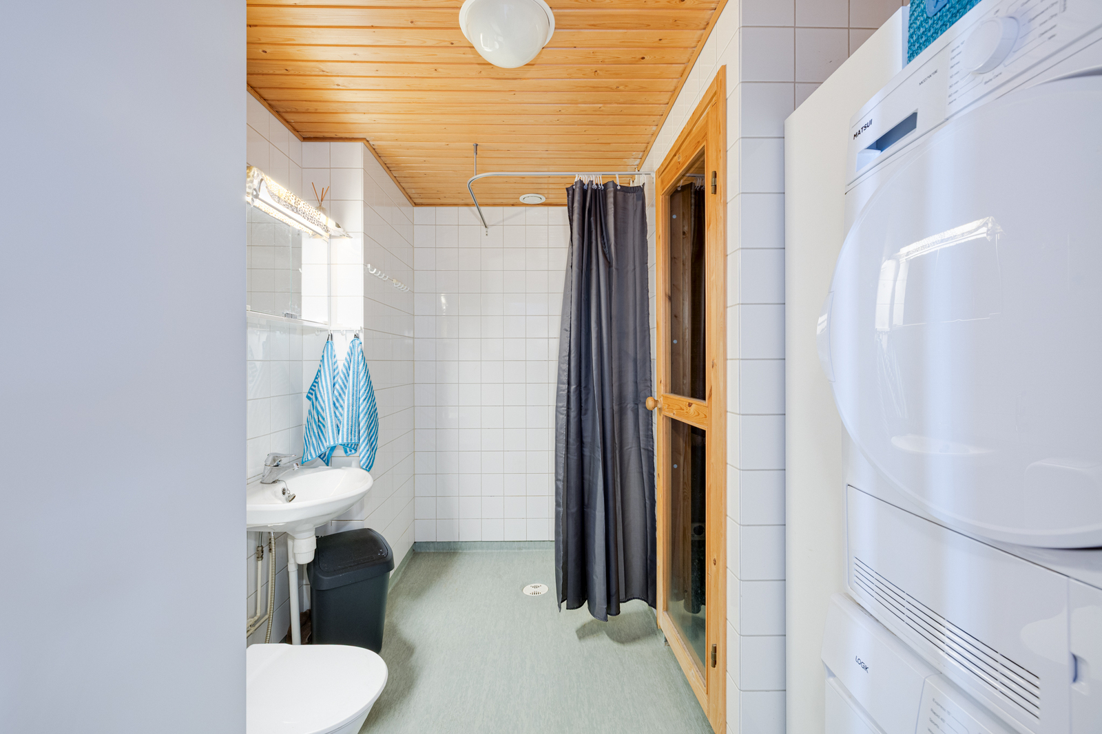Lämminvesivaraaja uusittu 07/2025 Varustus: pesukoneliitäntä, lattialämmitys, wc-istuin, suihku, peilikaappi, kylpyhuonekaapisto Seinät: kaakeli Lattia: muovi |