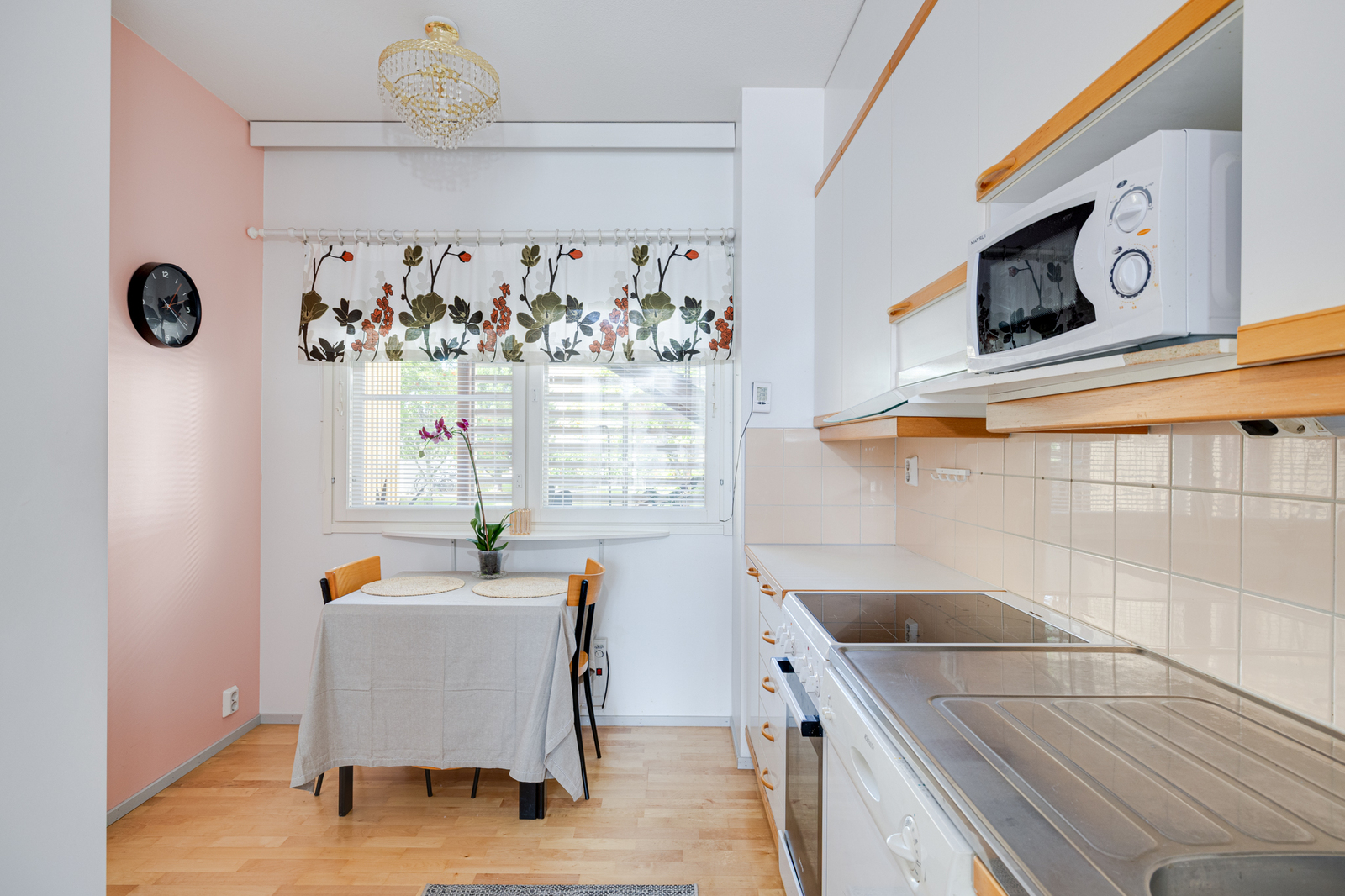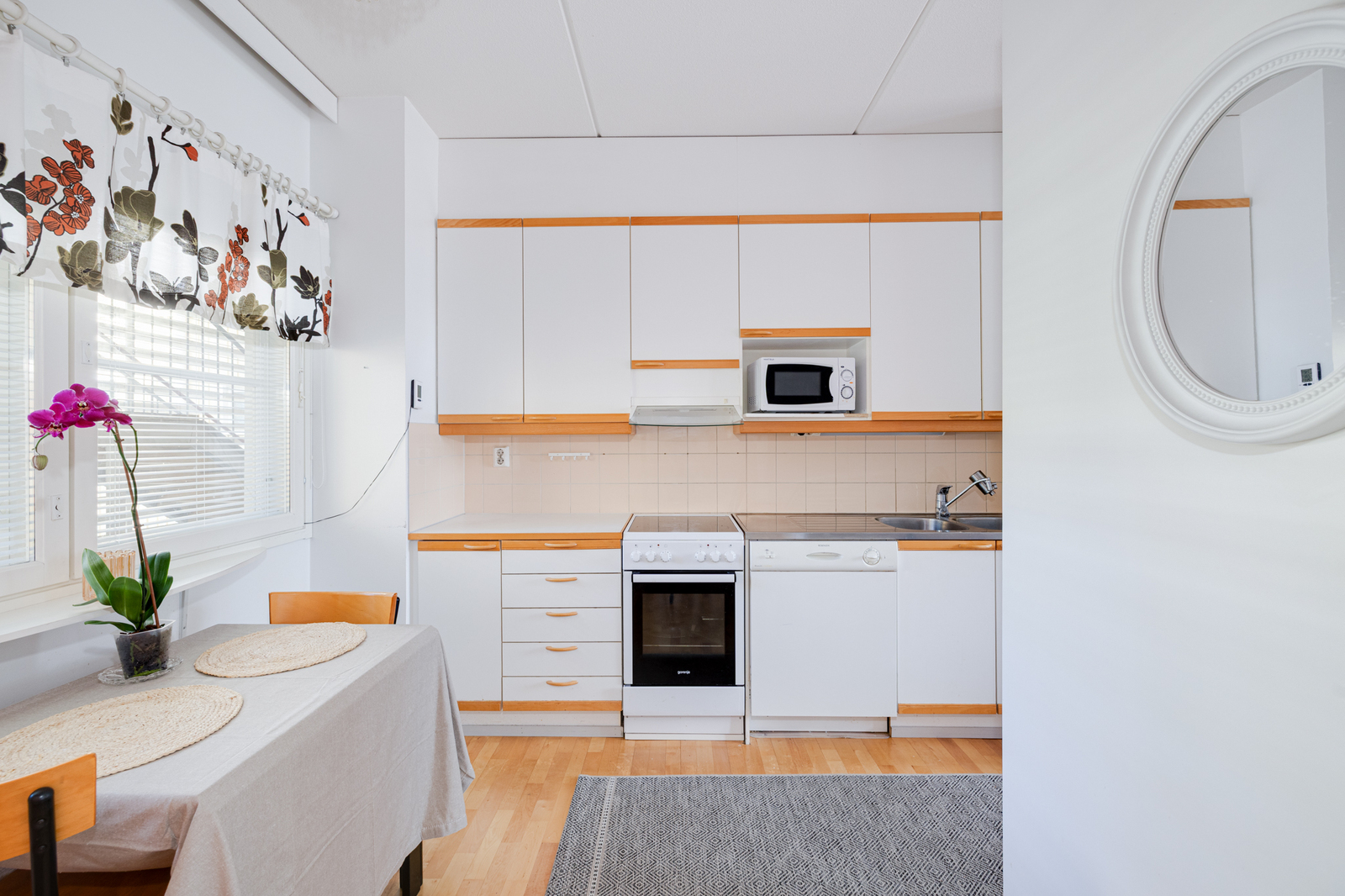 Varustus: jääkaappi/pakastin, mikroaaltouuni, astianpesukone, liesituuletin / hormi. Työtasot: laminaatti. Liesi: keraaminen. Lattia: parketti. Seinät: maalattu |