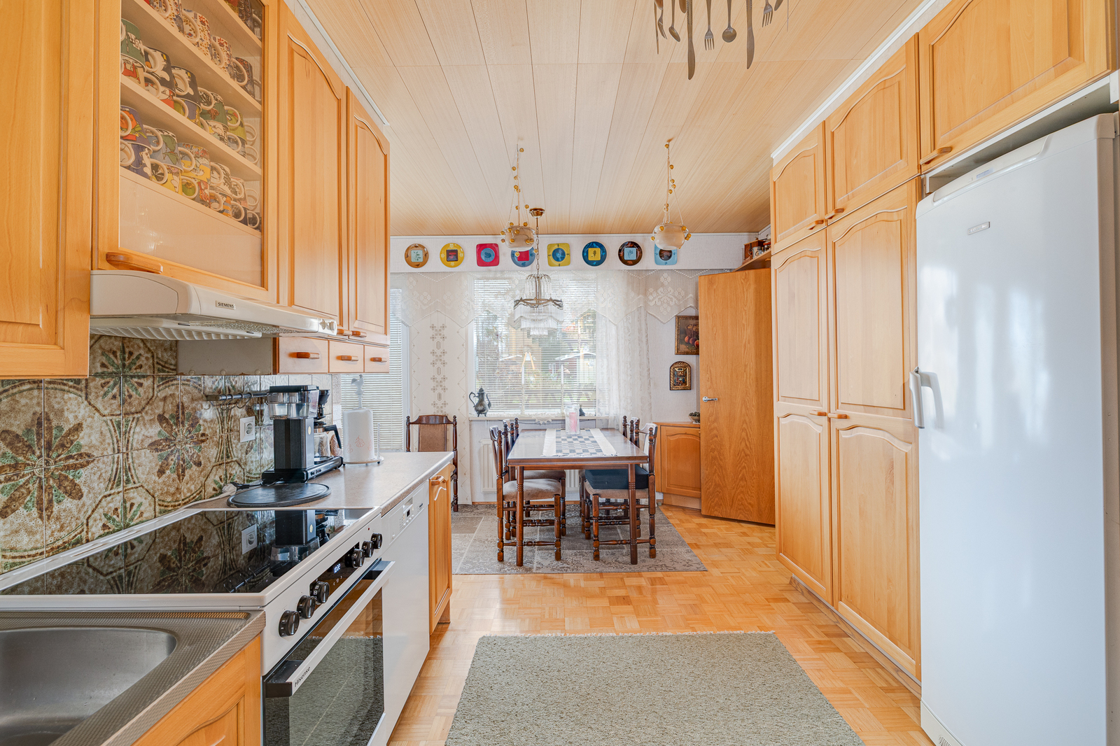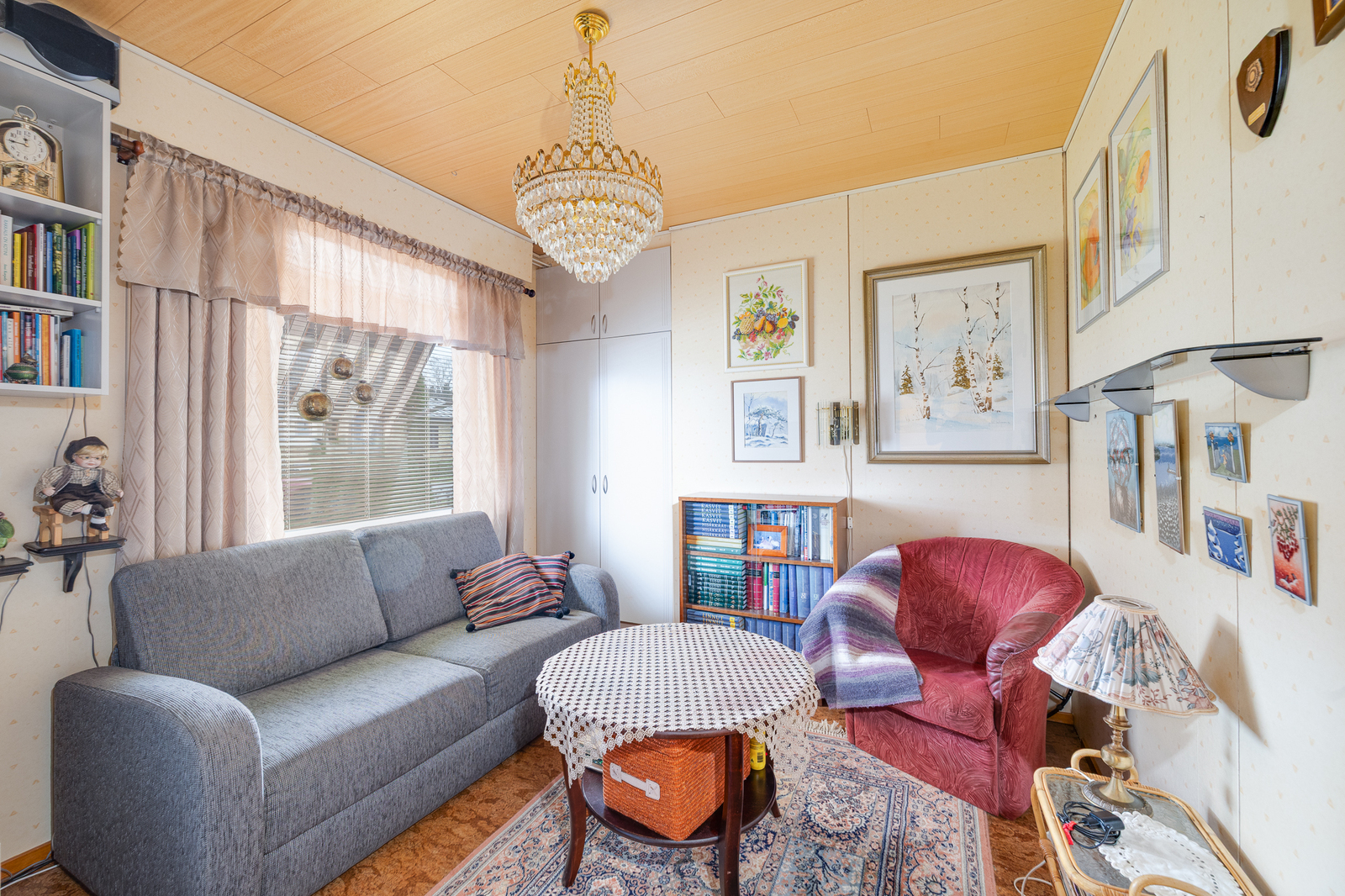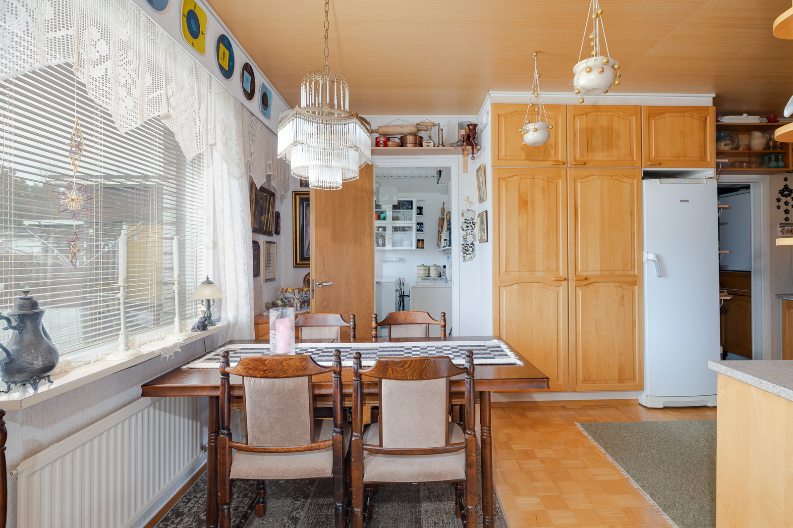 Kodikas ja lämminhenkinen omakotitalo, josta on pidetty hyvää huolta vuosien varrella. Alkuperäinen omistaja on asunut talossa alusta lähtien, mutta nyt on tullut aika siirtyä kevyempään asumiseen – sinun mahdollisuutesi tarttua tilaisuuteen! Tässä yhdessä tasossa olevassa kodissa on toimiva pohjaratkaisu: 4h + k + s + khh, yhteensä 119,5 m². Säilytystilat ovat kunnossa – entinen autotalli toimii nyt varastona ja öljysäiliöhuoneena, ja sen eteen on rakennettu kylmä autotalli. Kolme tilavaa makuuhuonetta tarjoavat riittävästi tilaa perheelle tai etätyöpisteelle. Olohuoneessa tunnelmaa luo kaunis takka. Keittiö sijaitsee olohuoneen vieressä ja tarjoaa runsaasti kaappitilaa sekä erillisen ruokakomeron. Terassille pääsee kätevästi sekä olohuoneesta että kodinhoitohuoneesta. Talossa on myös kaksi wc:tä – toinen kylpyhuoneessa ja toinen päämakuuhuoneen yhteydessä. Talo sijaitsee omalla, 1 014 m²:n tontilla, jota kehystää kaunis ja huolella hoidettu puutarha. Ensi keväänä ja kesänä on ilo seurata, mitä kaikkea puutarha tarjoaa – kukintaa, vehreyttä ja viihtyisyyttä. ************************************* Ett hemtrevligt och varmt egnahemshus som tagits väl om hand genom åren. Den ursprungliga ägaren har trivts här sedan starten – men nu är det dags att lämna plats för någon ny att skapa sitt hem. Detta enplanshus har en välplanerad layout: 4 rum + kök + bastu + grovkök, totalt 119,5 m². Det finns gott om förvaringsutrymme – det tidigare garaget används idag som förråd och oljetankrum, och framför det har man byggt ett kallgarage. Huset rymmer tre rymliga sovrum, perfekt för familjen eller för att skapa ett hemmakontor. I vardagsrummet sprider en vacker öppen spis en trivsam stämning. Köket ligger intill vardagsrummet och erbjuder gott om skåputrymme samt ett separat skafferi. Till terrassen kommer du både från vardagsrummet och från grovköket. Det finns två toaletter – en i badrummet och en smidigt placerad intill det största sovrummet. Den egna tomten är 1 014 m² stor. Den vårdade, grönskande trädgården som omger huset bjuder på blomsterprakt och lugn – det blir spännande att se vad våren och sommaren kommer att avslöja i denna vackra trädgård.