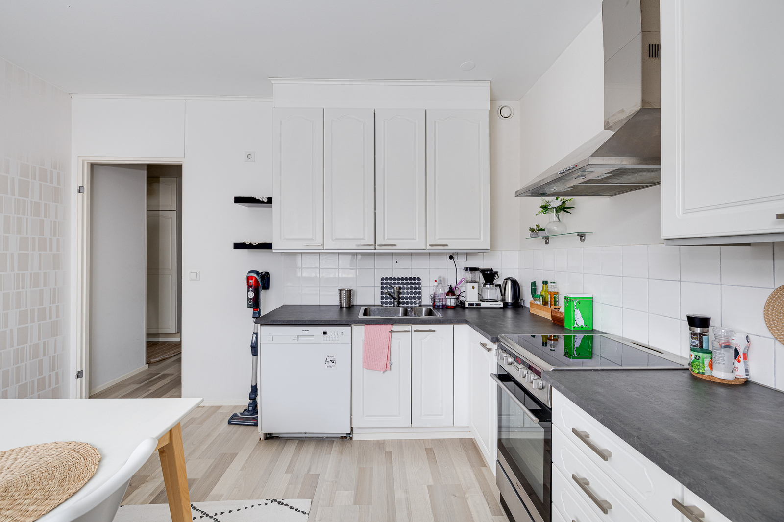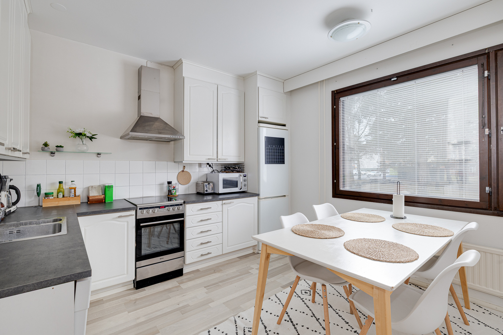 Keittiö: Kaappien ovet uusittu 2010-luvulla. Työtasot, pesuallas, hana, induktioliesi ja liesituuletin uusittu 2018. Varustus: jääkaappi/pakastin, astianpesukone, liesituuletin / suodatin. Työtasot: laminaatti. Liesi: induktio. Lattia: laminaatti. Seinät: maalattu
