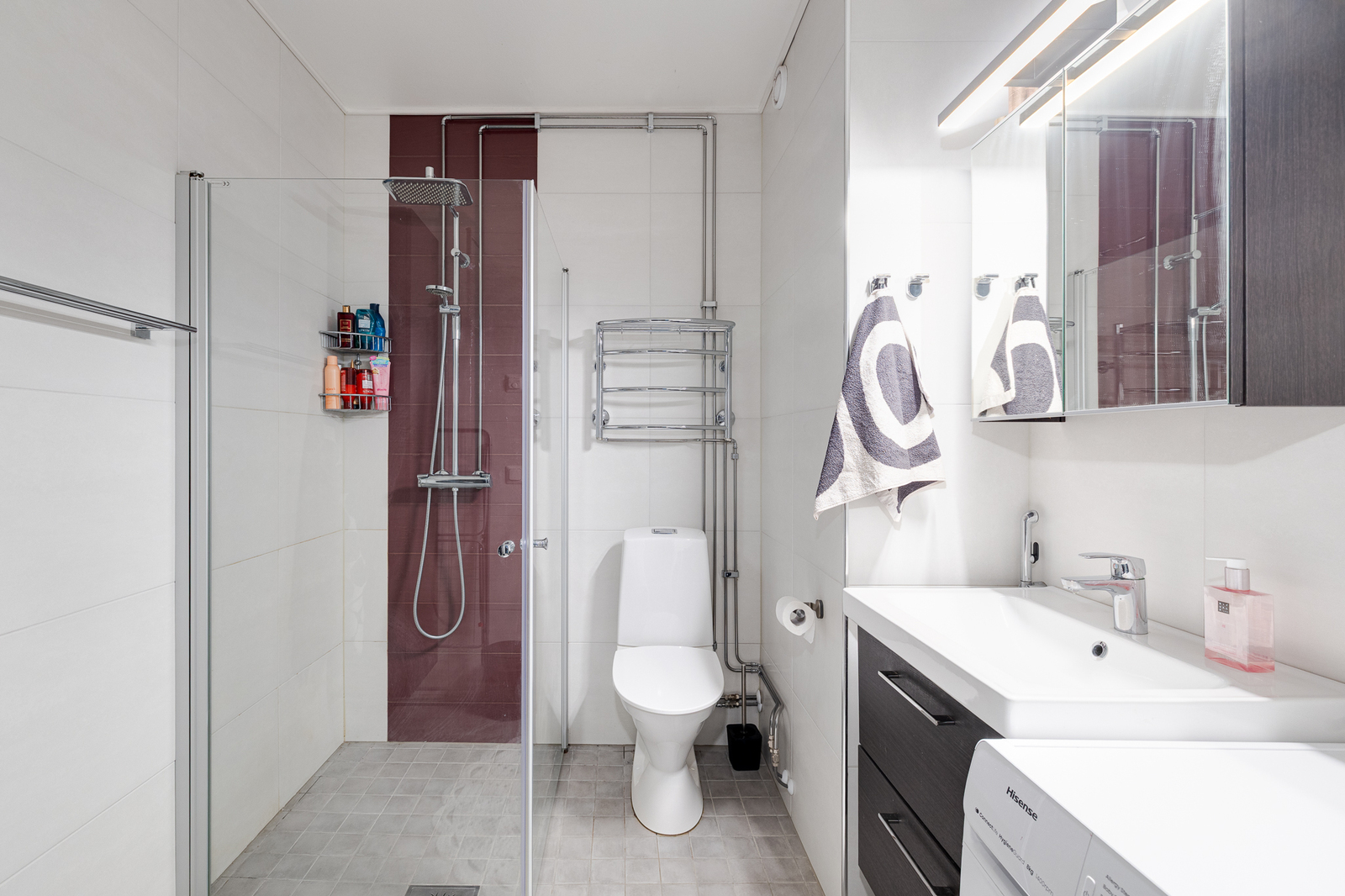 Pesutilat: Remontoitu 2018 (raportti olemassa) Varustus: suihkuseinä, pesukoneliitäntä, wc-istuin, suihku, peilikaappi, kylpyhuonekaapisto Seinät: kaakeli Lattia: laatta